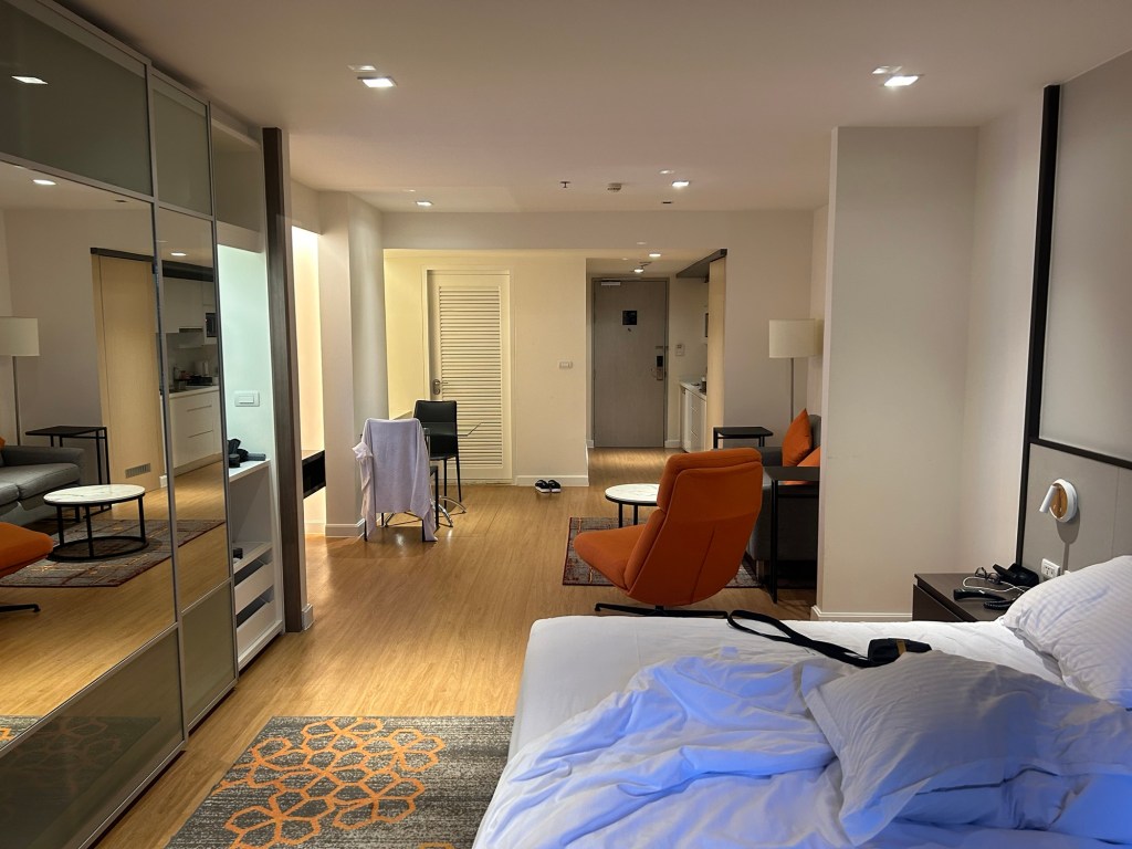 When I got into the hotel (ParkRoyal Suites Bangkok), check-in was pretty quick, which I was thankful for because I was hoping I could lay down right away. The hotel rep gave me a high floor for the type of room I booked, and non-smoking too. King-sized bed as well. After I was through with the usual hotel “here-is-your-room-sir” chat, it was close to 3AM. I changed into some comfortables quickly and planned things out.