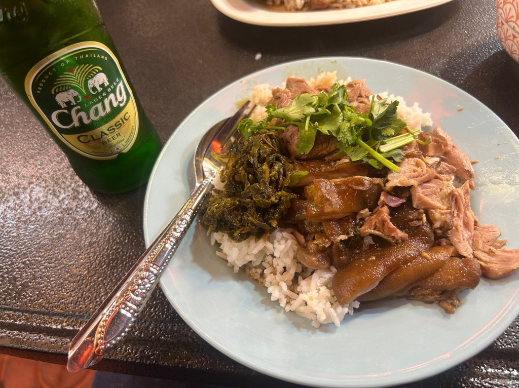 So one of the things I wanted to try was that stewed pork leg, or khao ka moo. I looked for a stall that had a seat for one. Nope for several. The eating tours really are in high hear, huh. All tables nabbed. So I started to eyeball the inner streets on the side of the main road and see if there were hidden stalls on the sides I can rest for and eat one. Luckily, one had a seat. And sells beer.