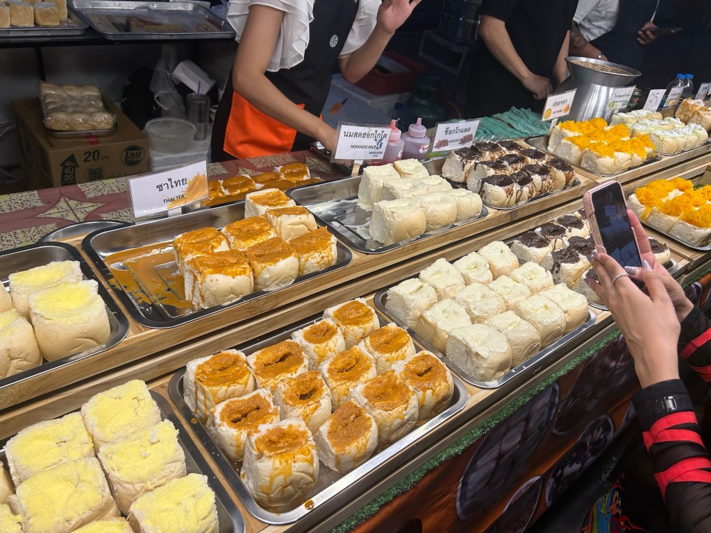 A stall was selling many bread filled with various flavors, so I bought 4 for 100 baht. One Thai milk tea, one pandan, one chocolate and one coconut. They steamed it for a few minutes before putting them in takeaway containers.