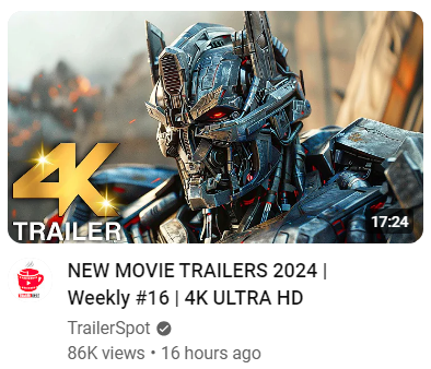 The one above is from a channel called “TrailerSpot”. Thumbnail doesn’t say what it has in store for the viewer, aside from an overly-stylized “4K TRAILER” indication on the lower left. Basically take a picture, slap a logo on the video, that’s it. One could argue for simplicity, but what’s going against it is that there’s nothing to pull out of the thumbnail except “4K” and “Trailer” because a good number of people won’t know where the background’s from.