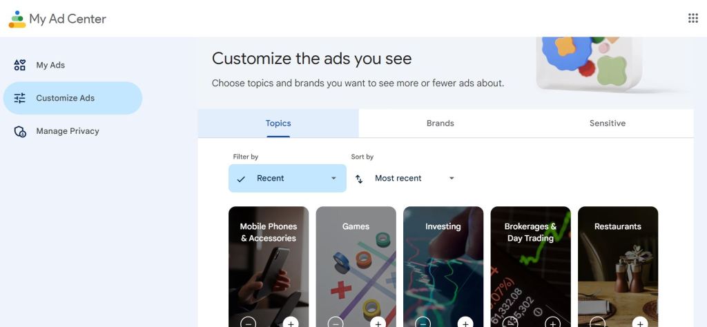 You can adjust the ads by Topics (bulk manager), by Brands (specific manager), or by Sensitive (topical manager). You don’t want to see cars anymore? You can. You want to see more phones? Sure. But true to form, Google/YouTube only pre-screens topics and brand names to certain sets, so you couldn’t really search or specify the parts you have no more interest in, but I’d take this over nothing. So every 2-3 months, I manually review these and compare to my homepage, and after a week I know which topics and brands to avoid for ads. I zealously manage this part.