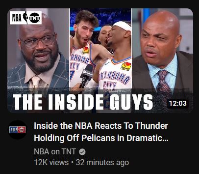 The above one from NBA on TNT is an example of a very good thumbnail. You got the figureheads talking about the game, check. The OKC guys are in the middle, check. So the thumbail shows to the viewers instantly what the video will be about. Those pictures of Chuck, Shaq and the 3 guys from OKC were from the actual show and the actual game as well. No stock images of any of the commentators doing the “shocked face” baloney. The text “The Inside Guys” is good enough, prominent and used a good font with a semi-transparent background. Logo is present on the upper left, not too small and not too big. The thumbnail’s clean. Looks good on both white and black background. Title is also good, no lies detected. It’s a bit long for two lines but as far as text content and intent goes, it’s OK. All in all, it’s a proper business-formatted video thumbnail and title. 👍👍👍👍👍