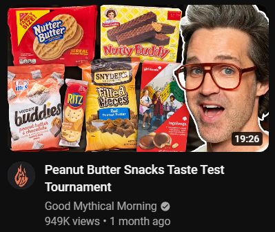 The above one from Good Mythical Morning is a good thumbnail, but engages in some things I truly dislike, just personally – the face template. I’m not sure if the above face of Link was from the video itself and pulled by a crafty editor, but it reeks of “template”. Like he posed for it after the video was shot. Not taking anything away from them, I just don’t like it. But it’s already part of their charm and shtick. I think of it like how The Rolling Stones often play “(I Can’t Get No) Satisfaction” on tours. The background of the packs of peanut butter snacks eaten at the video is OK, good arrangement. No logos or text needed anyway, the thumbnail speaks for itself. Title is also good and honest, short and to the point. Still a good thumbnail and title, but I couldn’t shake off what I disliked. Still watched it though, because I like Rhett and Link and I like peanut butter. Creamy. Chunky can go die in a Long John Silver’s dumpster. 👍👍👍👍