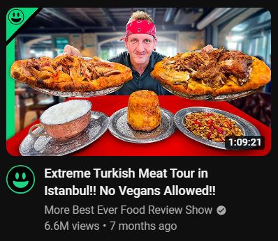 Let me start with: I like Sonny. He’s a more genial and accomodating version of Andrew Zimmern, with a healthy sprinkle of the kind of mentality that does dick jokes on the regular, with a bandanna on the side (maybe his forehead’s big). He’s fun to watch and he always puts his best foot forward, respectfully. The one above is from his secondary channel. I like the thumbnail. Sometimes simple and minimal can be beautiful. He’s presenting Turkish food. The arrangement of the food pictures can be a lot better, but it’s not bad at all. A small “logo” is on the top left corner, nice. However, I am tearing the title down a notch. First, the extra exclamation mark. What’s the difference between “Extreme Turkish Meat Tour in Istanbul!” and “Extreme Turkish Meat Tour in Istanbul!!”, eh? Barely any. I do understand that in informal writing, multiple exclamation points are sometimes used to indicate stronger emphasis or emotion. Sure. But it’s just my personal preference to like “!!” a bit less. I prefer civility in my YouTube titles a bit more. Think of it as preferring donuts with heavy glaze or just simple cinnamon-sugar sprinkling. I like sprinkling more, by the way. Second, the adjacent part, “No Vegans Allowed!!”. I’m not sure the bait-y dig was necessary. Sure, I like a good “pretentious vegan” digs here and there, but only when it made sense. I watched the entire video. Nowhere did I feel that vegans would feel unwelcome in Istanbul. Last I’ve seen, Türkiye loves pickles. So, to sum. Thumbnail good, title is like a pitcher of sour milk. 👍👍👍👍