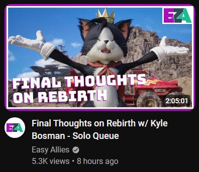 The one above is from Easy Allies, a channel that does great reviews and critiques of games, with some panel talks and podcast-esque discussions. Their logo is on the upper right, and it’s just the right size. Font used in thumbnail is OK, doesn’t really take away from the background and made brief to convey what the intention is. Background is OK as well, everyone loves cute cats that animate like Mickey Mouse. Like CNN, their thumbnail has borders too. But unlike CNN, the editor clearly chose a two-color border – the darker violet outside and the white border inside, giving the illusion of a “smaller” video thumbnail but with a hint of violet highlight. And the combo of colors aren’t desperately screaming for attention either, that’s good. Title is good, it conveys what the video will be and who will be on, although they should’ve used “Final Thoughts on FFVII Rebirth w/ Kyle Bosman – Solo Queue”. Small nit, but the thumbnail and title is very good. 👍👍👍👍👍