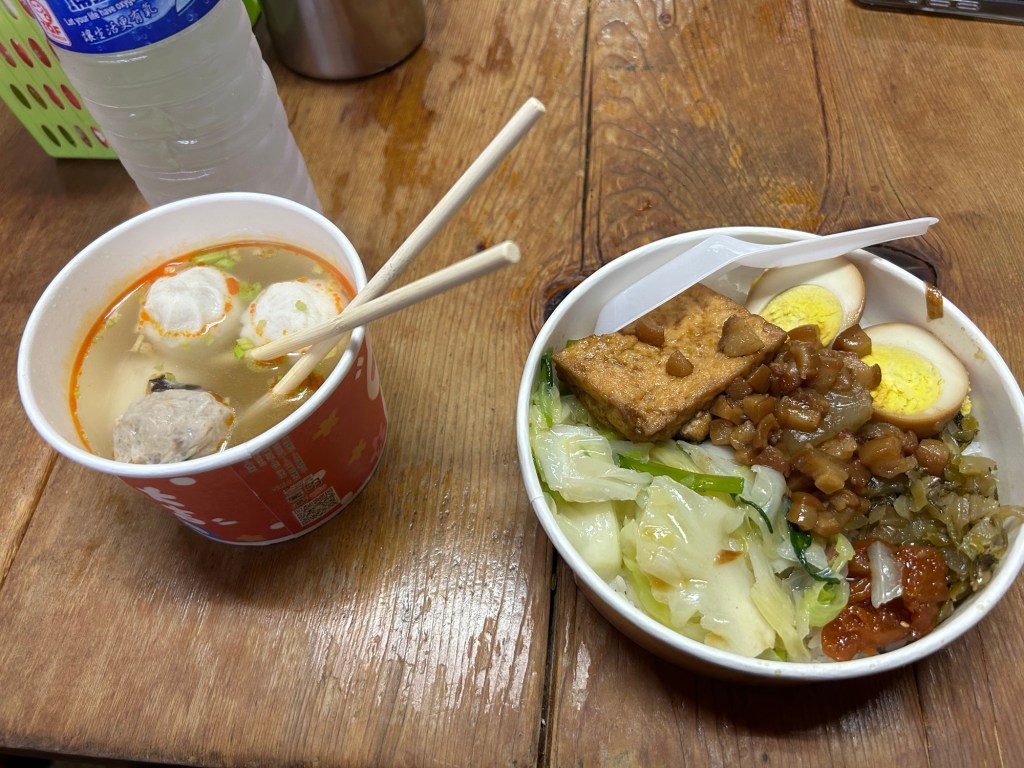 It was delicious, mind you. The braised pork and fried tofu (it was tofu, yes, with a bit of preserved taste… might be the stinky tofu) was good, and it helped that a lot of vegetables and half a tea egg were there. The soup and meatballs helped with satiety. Springy, some had bite, some had a delicate taste, some were springy. Nice. I spent a good 30 minutes on the table. As I was a single customer and the place was packed for lunchtime, I had to share a table with a group. One was a group of three dudes, the other was a backpacker couple.