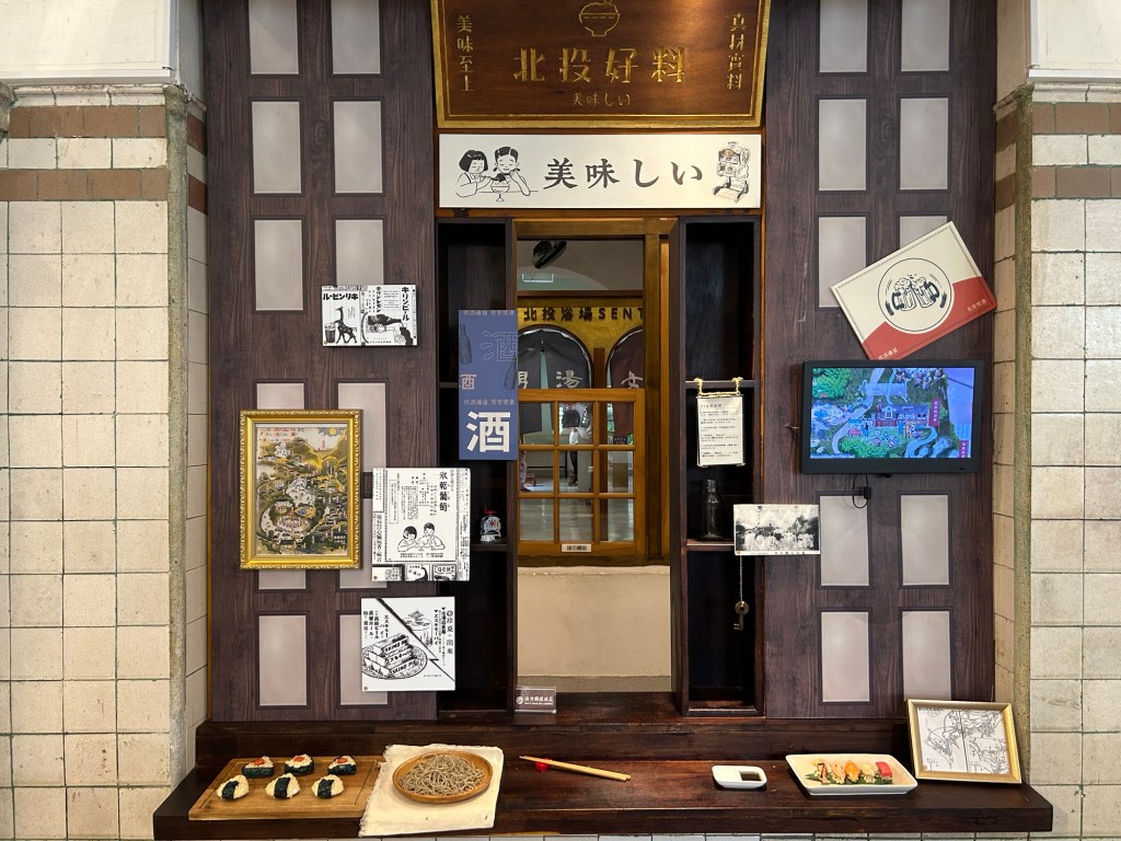 There was a generous rest area at the middle, a slipper-free padded tatami mats where people can sit and admire the view outside. Slightly to its side to the north, there was a small souvenir section where people could buy some more trinkets festooned with Beitou designs. For me, I already had three earlier. But as I saw there was a booth where you could make your own button pin with a design of your own choosing, I had to get one. I think it was 50NTD per pin. I chose a small blue one with a design marking Beitou’s renown as a hot spring place (design was a bathing pail floating on water with a white towel hanging out on the side).