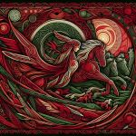 AI prompt: “Legend Of The Twilight, depict as Celtic Art using red and green colors”